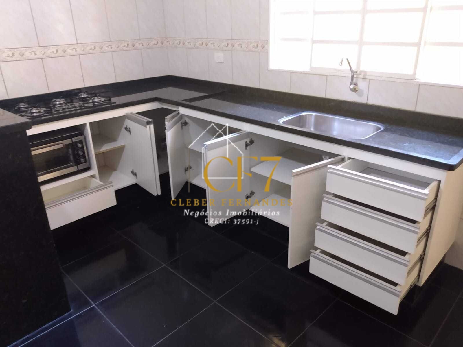 A residência possui Sala de Estar e Jantar Integradas, Cozinha com pia e balcão em granito com